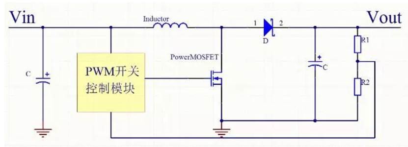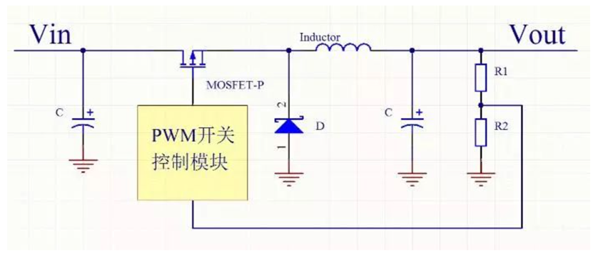 Buck 模式DCDC 结构主要由输入电容、功率MOS管、PWM模块、肖特基二极管功率电感、输出电容和输出调节电阻构成。DCDC开关电源这种结构模式决定了它输出噪声比较大。