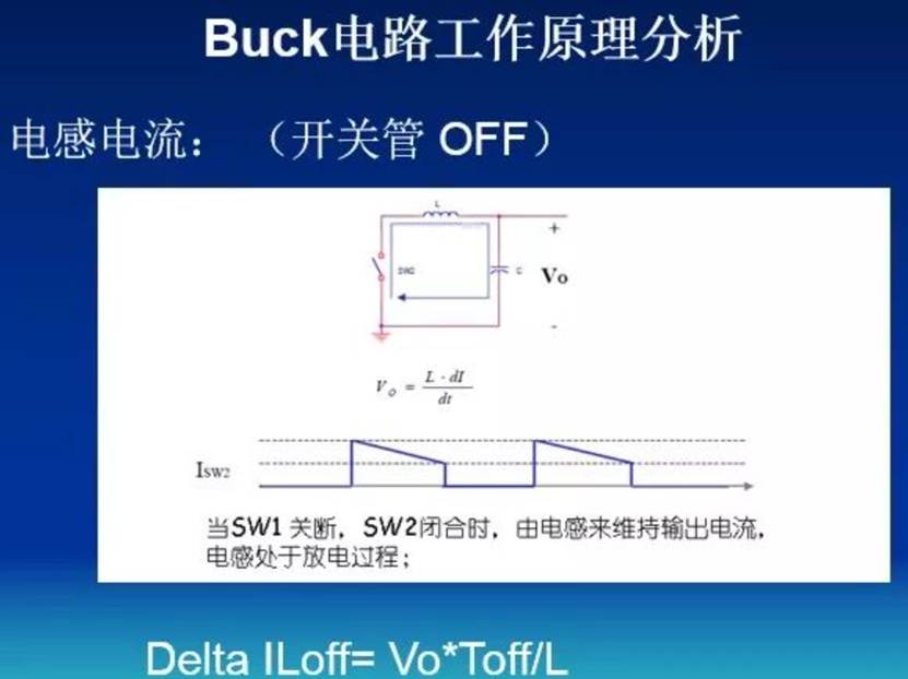 开关断开时, 电感电压等于输入电压减去输出电容的电压, 电感电流减少,电感储能减少, 电感储能向负载转移电能。