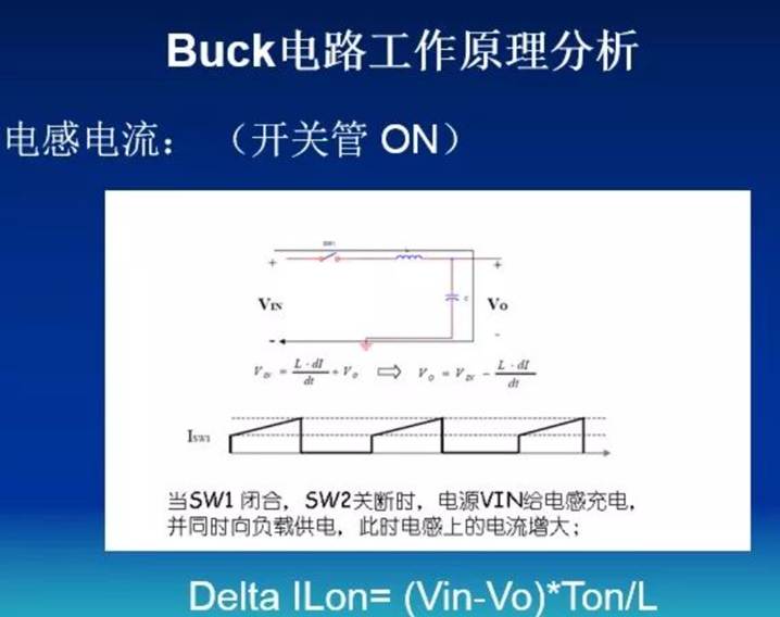 开关导通时, 输入电压流向电感, 电感电流线性增加,电感储能增加,电源向电感转移电能。